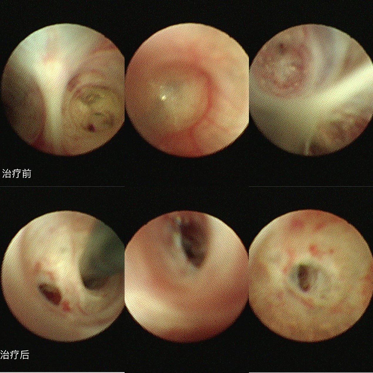 按照治疗计划,再行气管镜检查,患者左下叶前基底段8级、外基底段9-10级、右上叶、下叶前基底段原扩张管腔部分保持扩张,部分闭塞,上次气管镜治疗效果维持良好。左上叶舌段10级细支气管、左上叶前段7级、右下叶外、后基底段远端部分细支气管(9级)呈闭塞样改变,右下叶背段远端管腔部分细支气管(8-9级)呈闭塞样改变,予多次活检钳扩张、冷冻治疗管腔较前明显通畅。