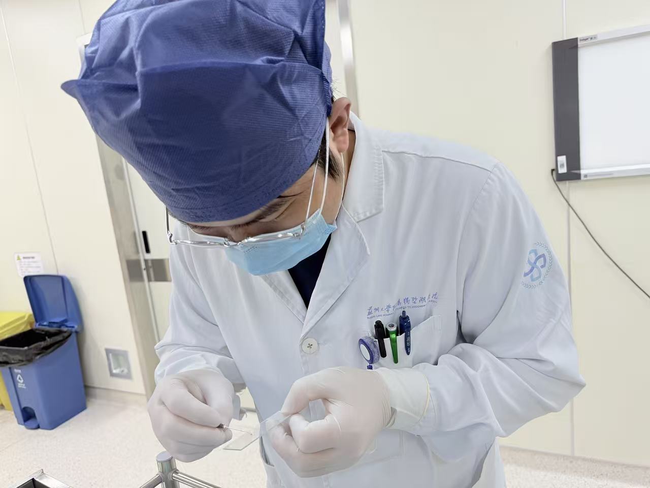 精准定位后,团队迅速开展TBLB(经支气管镜肺活检),精准获取病灶组织样本。与传统病理检查需等待3-5天不同,本次手术引入ROSE快速现场评估能够快速分析病理。我院张志阳医师在手术现场对样本进行快速染色、制片与显微镜观察,短短3分钟病理结果便明确反馈,明确病灶组织中存在肿瘤细胞。快速现场评估不仅避免了患者因等待病理结果而延误治疗时间,更省去了二次手术的麻烦,完美解决了肺部病灶诊断慢的痛点。