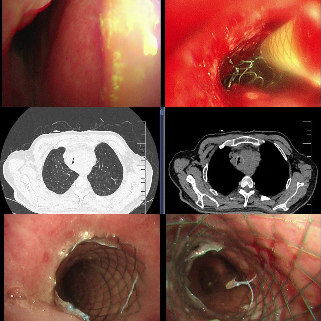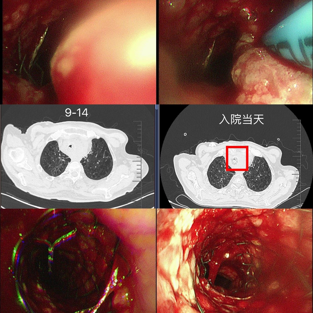 出院后,龚先生在苏大附四院肿瘤科接受了放疗(食管肿瘤灶及转移淋巴结)、替雷利珠单抗免疫治疗联合替吉奥口服化疗,8月复查时虽提示纵隔占位增大、局部压迫食管气管,但整体状态尚可。然而,9月中旬,他再次突发胸闷气喘,此时的龚先生虽神志清楚但精神极差,饮食睡眠受严重影响,不能平卧。龚先生被紧急送至我院急诊,收住入院,患者在无创呼吸机辅助下仍呼吸急促、呼吸窘迫。蒋军红主任团队为其紧急手术治疗,在手术室气管镜镜下景象触目惊心:原支架上端新生物已几乎完全阻塞气道,狭窄程度接近95%,且伴有活动后出血,随时可能因血块堵塞或缺氧危及生命。
