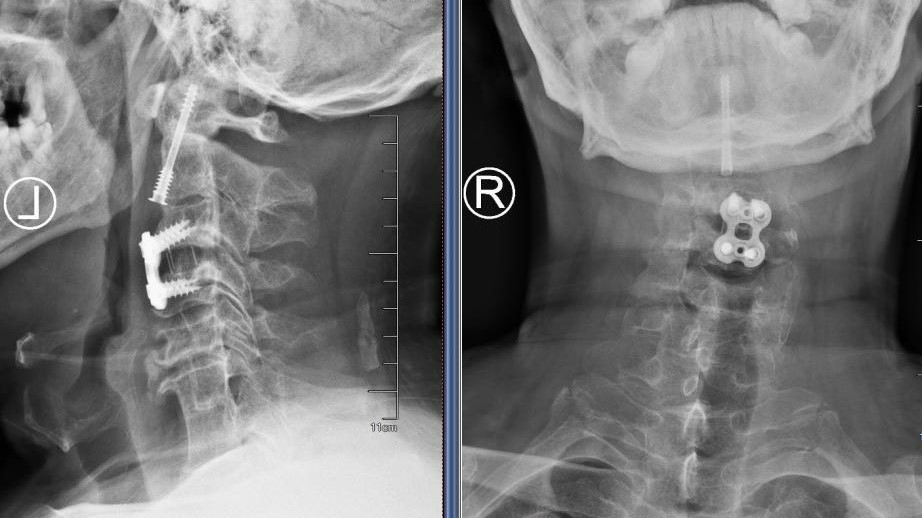 患者侯师傅在工地作业中不幸被坠落的钢筋重重砸中颈部,致使四肢完全无法活动。紧急送医后,查体显示其四肢肌力仅为0-1级,处于近乎全瘫的状态。完善影像学检查提示:枢椎齿状突骨折并向后倾倒,严重压迫脊髓;同时合并有严重的颈椎发育畸形及多处先天性融合。脊髓的严重受损使侯师傅的生命岌岌可危,手术减压固定刻不容缓。